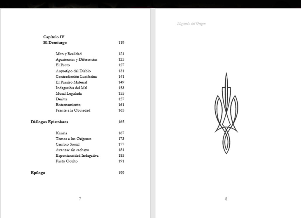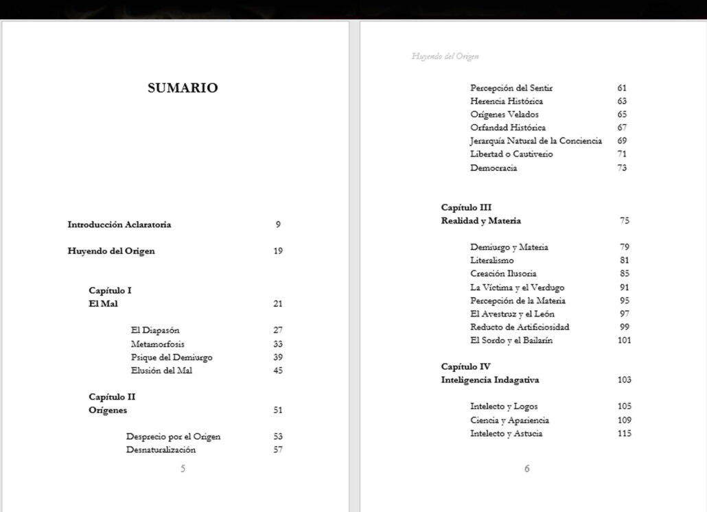 “Huyendo del Origen”, es la primera parte de un tratado novelado sobre el Mal, refiriéndose con ello, simbólicamente, a la causa legendaria de todo sufrimiento (Una segunda parte se ofrece en «El Engaño Subyacente»).